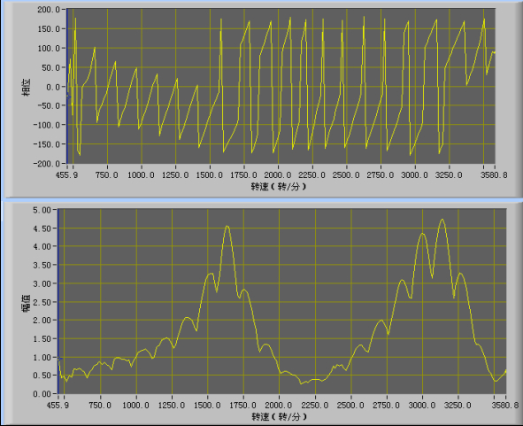 波特圖是用來確定臨界轉速的重要工具,如果振幅曲線出現波峰,同時相位發生急劇增加,且增加幅度大于70o,這時所對應的轉速有可能是該測點所處的轉子或相臨轉子的臨界轉速。